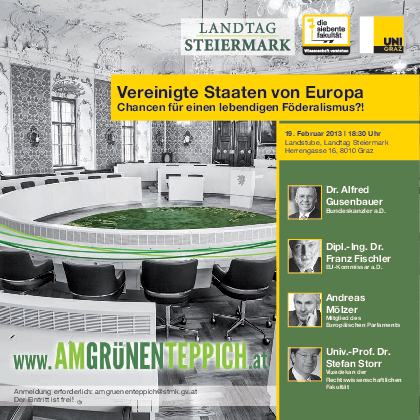 Den Start dieser Veranstaltung machen am 19. Februar 2013 um 18:30 Bundeskanzler a.D. Dr. Alfred Gusenbauer, EU-Kommissar a.D. Dipl.-Ing. Dr. Franz Fischler, MEP Andreas Mölzer und Univ.-Prof. Dr. Stefan Storr zum Thema “Vereinigte Staaten von Europa - Chancen für einen lebendigen Föderalismus?!“.